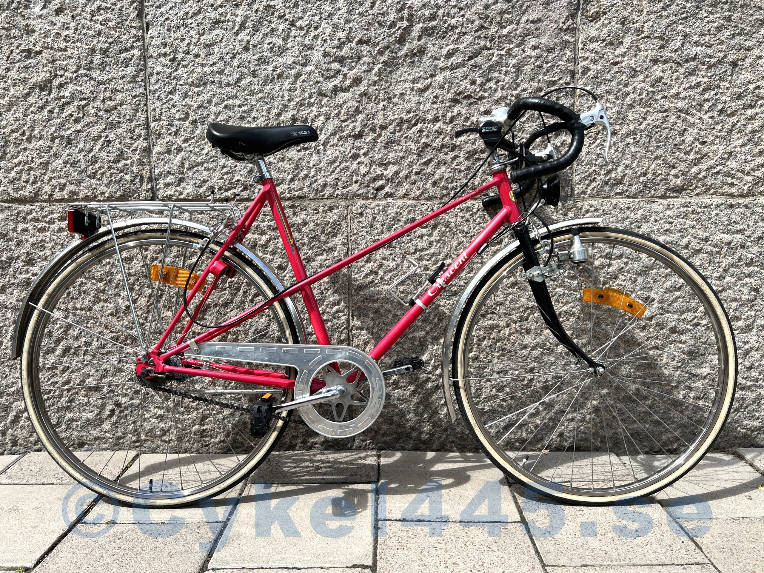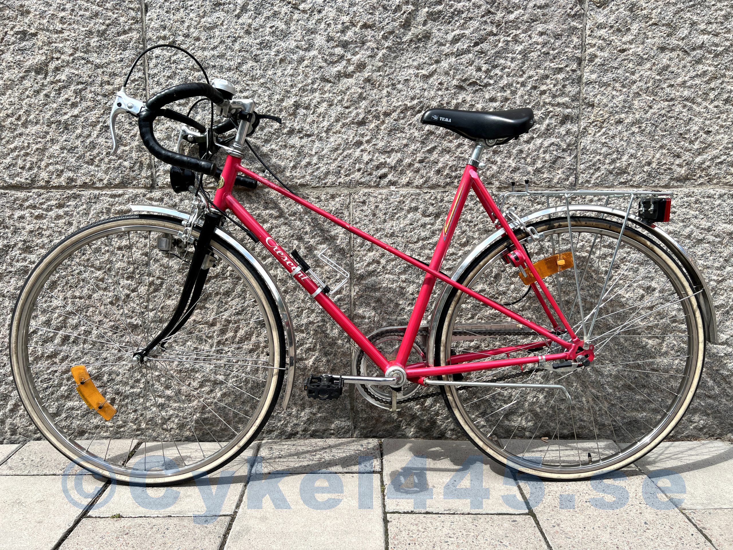 En femväxlad Crescent Pentasport damcykel från 198-talet i jettefin skick — faktiskt som ny. Idag kallas sådana cyklar ”gravel” och ibland kallar man de ”racercyklar” (som är fel). Den typ av cyklar med bockstyre passar perfekt både för stadens asfalt och för grusvägar. Inbyggda i navet växlar gör cykeln lätt i underhåll och ger dig mölighet att njutja av fotbromsen.